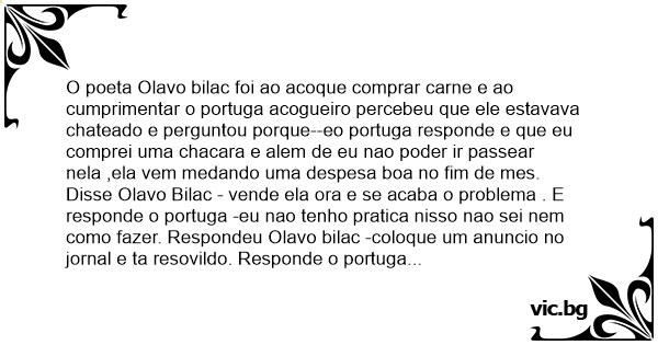 O poeta Olavo bilac foi ao acoque comprar carne e ao cumprimentar o portuga acogueiro percebeu que ele estavava chateado e perguntou porque--eo portuga responde e que eu comprei uma chacara e alem de eu nao poder ir passear nela ,ela vem medando uma despesa boa no fim de mes. Disse Olavo Bilac - vende ela ora e se acaba o problema . E responde o portuga -eu nao tenho pratica nisso nao sei nem como fazer. Respondeu Olavo bilac -coloque um anuncio no jornal e ta resovildo. Responde o portuga -eu nao sei fazer . Reponde Olavo bilac -meda uma caneta e um papel que eu bolo um anuncio para voce e comecou a escrever o anuncio ''vende-se uma linda propriedade rural com arvores frondosas ao lado de lindo lago de aquas cristalinas onde a lus do sol espairao sua grandesa e os passaros gorjeiao com uma casa que mais parece um castelo dos grandes reis. ai entregou ao portuga e foi embora. Passado uma semana Olavo Bilac veio no acogue e perguntou para o portuga e ai vendeu a propriedade o portuga responde-voce e louco acha que eu vou vender um negocio bunito daquele.