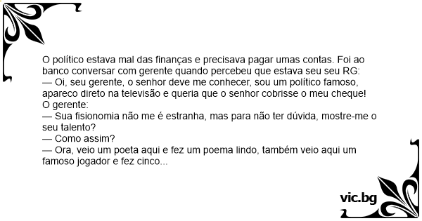 — Oi, seu gerente, o senhor deve me conhecer, sou um político famoso, apareco direto na televisão e queria que o senhor cobrisse o meu cheque!