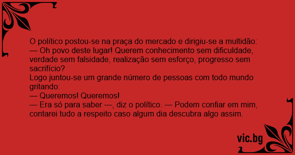 — Era só para saber —, diz o político. — Podem confiar em mim, contarei tudo a respeito caso algum dia descubra algo assim.