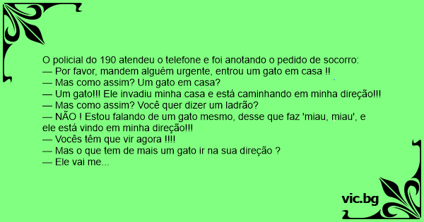 O policial do 190 atendeu o telefone e foi anotando o pedido de socorro: — Pelo amor de Deus! Mande alguém urgente que entrou um gato em casa! — Mas como assim, meu senhor? Um gato? — Sim, um gato, é uma emergência! — O senhor está usando algum tipo de código? — Não! É um gato mesmo! É caso de...