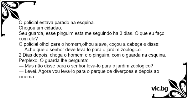 2 Dias depois, chega o homem e o pinguim, com o guarda na esquina. Perplexo. O guarda lhe pergunta: