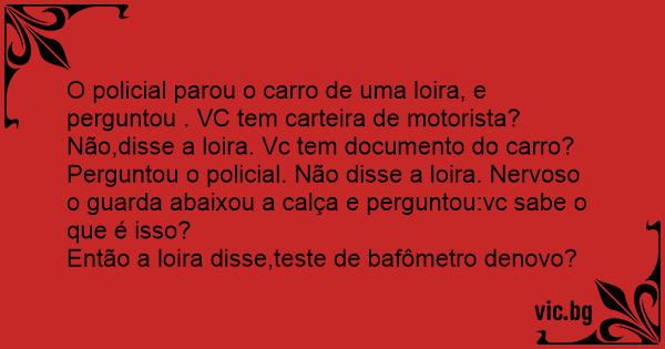 O policial parou o carro de uma loira, e perguntou . VC tem carteira de motorista?Não,disse a loira. Vc tem documento do carro?Perguntou o policial. Não disse a loira. Nervoso o guarda abaixou a calça e perguntou:vc sabe o que é isso?