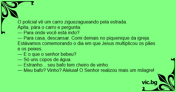 — Meu bafo? Vinho? Aleluia! O Senhor realizou mais um milagre!