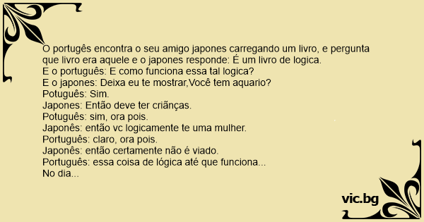 O portugês encontra o seu amigo japones carregando um livro, e pergunta que livro era aquele e o japones responde: É um livro de logica.