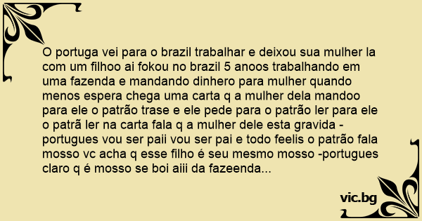 O portuga vei para o brazil trabalhar e deixou sua mulher la com um filhoo ai fokou no brazil 5 anoos trabalhando em uma fazenda e mandando dinhero para mulher quando menos espera chega uma carta q a mulher dela mandoo para ele o patrão trase e ele pede para o patrão ler para ele o patrã ler na carta fala q a mulher dele esta gravida -portugues vou ser paii vou ser pai e todo feelis o patrão fala mosso vc acha q esse filho é seu mesmo mosso -portugues claro q é mosso se boi aiii da fazeenda vizinha entrava na sua roça e cumia sua vaka a se nacesse um bizerro era seu o era do vizinhoo -patrão era meu claroo -portugues intão o filho é meu brigado Jesus kkkkkk Vota ai