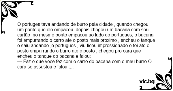 O portuges tava andando de вurrо pela cidade , quando chegou um ponto que ele empacou ,depois chegou um bacana com seu cartão ,no mesmo ponto empacou ao lado do portugues, o bacana foi empurrando o carro ate o posto mais proximo , encheu o tanque e saiu andando ,o portugues , viu ficou impressionado e foi ate o posto empurrando o вurrо ate o posto , chegou pro cara que encheu o tanque do bacana e falou: