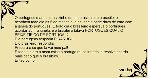 O portugeus manuel era vizinho de um brasileiro, e o brasileiro acordava todo dia as 5 da matina e ia na janela onde dava de cara com a janela do portugues. E todo dia o brasileiro esperava o portugues acordar abrir a janela. e o brasileiro falava PORTUGUES QUAL O PEIXE TIPICO DE PORTUGAL?