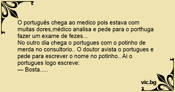 No outro dia chega o portugues com o potinho de меrdа no consultorio.. O doutor avista o portugues e pede para escrever o nome no potinho.. Ai o portugues logo escreve: