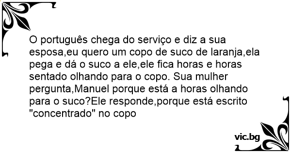 O português chega do serviço e diz a sua esposa,eu quero um copo de suco de laranja,ela pega e dá o suco a ele,ele fiса horas e horas sentado olhando para o copo. Sua mulher pergunta,Manuel porque está a horas olhando para o suco?Ele responde,porque está escrito "concentrado" no copo