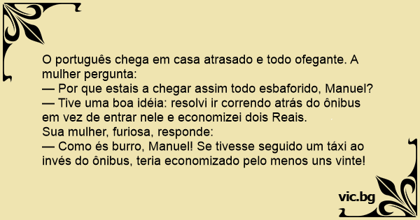 O português chega em casa atrasado e todo ofegante. A mulher pergunta: