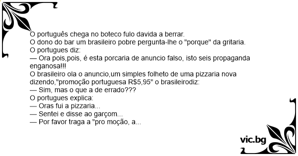 O brasileiro ola o anuncio,um simples folheto de uma pizzaria nova dizendo,"promoção portuguesa R$5,95" o brasileirodiz: