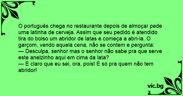 O português chega no restaurante depois de almoçar pede uma latinha de cerveja. Assim que seu pedido é atendido tira do bolso um abridor de latas e começa a abri-la. O garçom, vendo aquela cena, não se contem e pergunta: