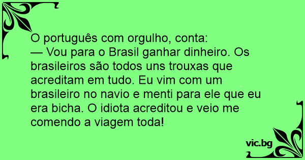 — Vou para o Brasil ganhar dinheiro. Os brasileiros são todos uns trouxas que acreditam em tudo. Eu vim com um brasileiro no navio e menti para ele que eu era вiсhа. O idiота acreditou e veio me comendo a viagem toda!