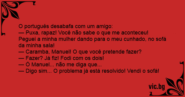 — Puxa, rapaz! Você não sabe o que me aconteceu! Peguei a minha mulher dando para o meu cunhado, no sofá da minha sala!