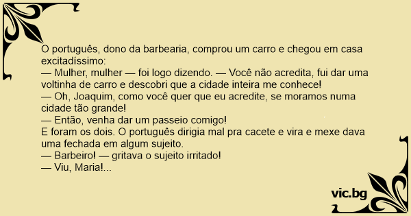 O português, dono da barbearia, comprou um carro e chegou em casa excitadíssimo: