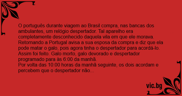 O português durante viagem ao Brasil compra, nas bancas dos ambulantes, um relógio despertador. Tal aparelho era completamente desconhecido daquela vila em que ele morava. Retornando a Portugal avisa a sua esposa da compra e diz que ela pode matar o galo, pois agora tinha o despertador para acordá-lo.