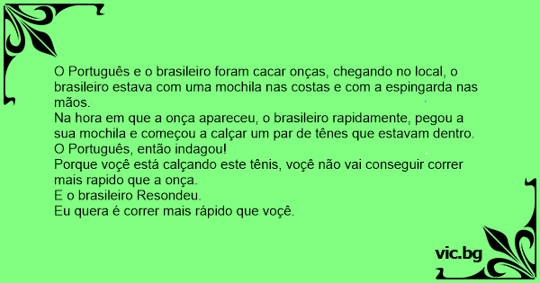 O Português e o brasileiro foram cacar onças, chegando no local, o brasileiro estava com uma mochila nas costas e com a espingarda nas mãos.