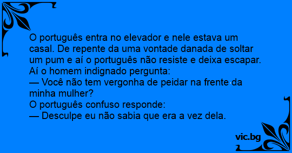 O português entra no elevador e nele estava um casal. De repente da uma vontade danada de soltar um pum e aí o português não resiste e deixa escapar. Aí o homem indignado pergunta: