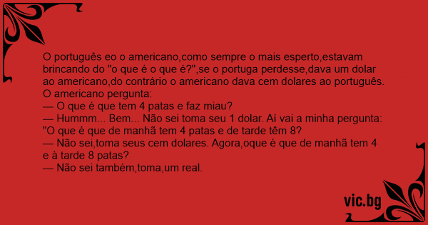 O português eo o americano,como sempre o mais esperto,estavam brincando do "o que é o que é?",se o portuga perdesse,dava um dolar ao americano,do contrário o americano dava cem dolares ao português. O americano pergunta: