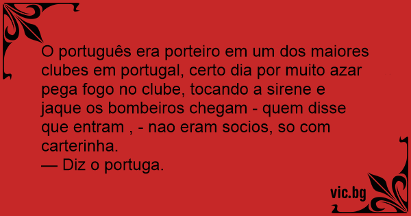 O português era porteiro em um dos maiores clubes em portugal, certo dia por muito azar pega fogo no clube, tocando a sirene e jaque os bombeiros chegam - quem disse que entram , - nao eram socios, so com carterinha.