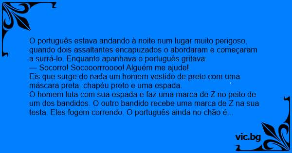 O português estava andando à noite num lugar muito perigoso, quando dois assaltantes encapuzados o abordaram e começaram a surrá-lo. Enquanto apanhava o português gritava: