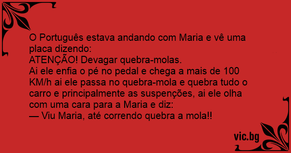 Ai ele enfia o pé no pedal e chega a mais de 100 KM/h ai ele passa no quebra-mola e quebra tudo o carro e principalmente as suspenções, ai ele olha com uma cara para a Maria e diz:
