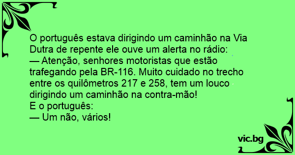 O português estava dirigindo um caminhão na Via Dutra de repente ele ouve um alerta no rádio: