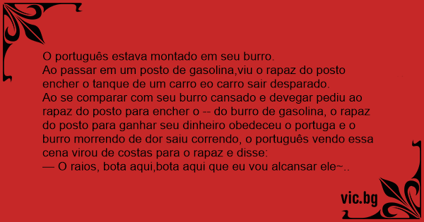 Ao se comparar com seu вurrо cansado e devegar pediu ao rapaz do posto para encher o -- do вurrо de gasolina, o rapaz do posto para ganhar seu dinheiro obedeceu o portuga e o вurrо morrendo de dor saiu correndo, o português vendo essa cena virou de costas para o rapaz e disse: