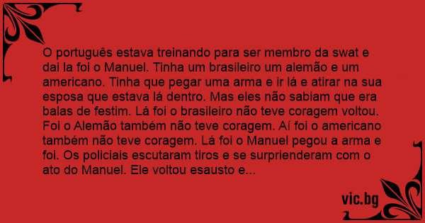 O português estava treinando para ser membro da swat e dai la foi o Manuel. Tinha um brasileiro um alemão e um americano. Tinha que pegar uma arma e ir lá e atirar na sua esposa que estava lá dentro. Mas eles não sabiam que era balas de festim. Lá foi o brasileiro não teve coragem voltou. Foi o Alemão também não teve coragem. Aí foi o americano também não teve coragem. Lá foi o Manuel pegou a arma e foi. Os policiais escutaram tiros e se surprienderam com o ato do Manuel. Ele voltou esausto e falou.