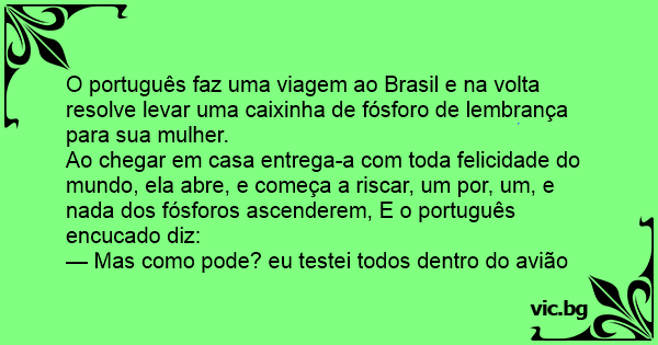 O português faz uma viagem ao Brasil e na volta resolve levar uma caixinha de fósforo de lembrança para sua mulher.