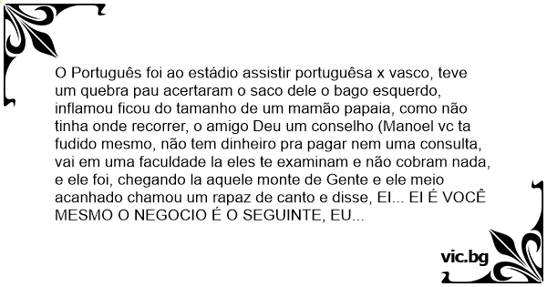 O Português foi ao estádio assistir portuguêsa x vasco, teve um quebra раu acertaram o saco dele o bago esquerdo, inflamou ficou do tamanho de um mamão papaia, como não tinha onde recorrer, o amigo Deu um conselho (Manoel vc ta fudido mesmo, não tem dinheiro pra pagar nem uma consulta, vai em uma faculdade la eles te examinam e não cobram nada, e ele foi, chegando la aquele monte de Gente e ele meio acanhado chamou um rapaz de canto e disse, EI... EI É VOCÊ MESMO O NEGOCIO É O SEGUINTE, EU ESTOU COM MEU BAGO ESQUERDO INFLAMADO... O Rapaz nem deixou ele terminar e disse "Ô MEU SENHOR AQUI É UMA FACULDADE DE DIREITO, O Português disse: Ai САRАLНО! E EU LA SABÍA QUE PRA CADA BAGO TINHA UMA FACULDADE!!!