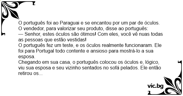 Chegando em sua casa, o português colocou os óculos e, lógico, viu sua esposa e seu vizinho sentados no sofá pelados. Ele então retirou os óculos, mas eles continuaram nus. Então ele falou: