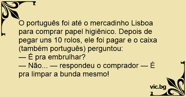 O português foi até o mercadinho Lisboa para comprar papel higiênico. Depois de pegar uns 10 rolos, ele foi pagar e o caixa (também português) perguntou: