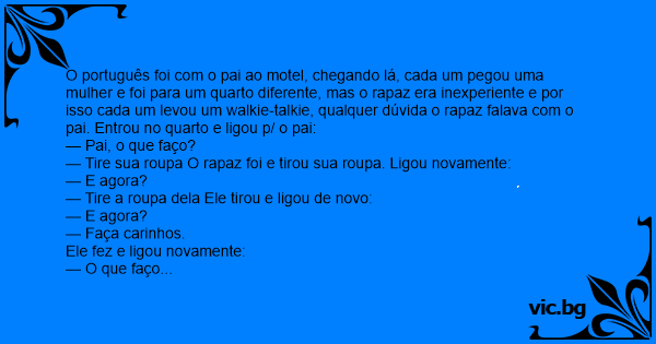O português foi com o pai ao motel, chegando lá, cada um pegou uma mulher e foi para um quarto diferente, mas o rapaz era inexperiente e por isso cada um levou um walkie-talkie, qualquer dúvida o rapaz falava com o pai. Entrou no quarto e ligou p/ o pai: