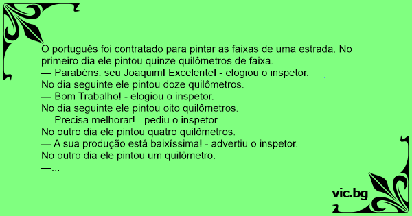 O Portugues foi contratado para pintar a linha central de uma estrada. No primeiro dia de trabalho, foi elogiado pelo patrão: — Parabéns, vocë conseguio pintar 2 quilometros em um dia, continue...