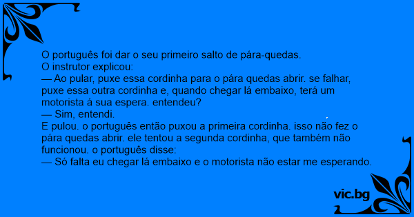 E pulou. o português então puxou a primeira cordinha. isso não fez o pára quedas abrir. ele tentou a segunda cordinha, que também não funcionou. o português disse: