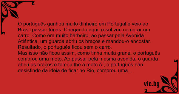 O português ganhou muito dinheiro em Portugal e veio ao Brasil passar férias. Chegando aqui, resol veu comprar um carro. Como era muito barbeiro, ao passar pela Avenida Atlântica, um guarda abriu os braços e mandou-o encostar. Resultado, o português ficou sem o carro.