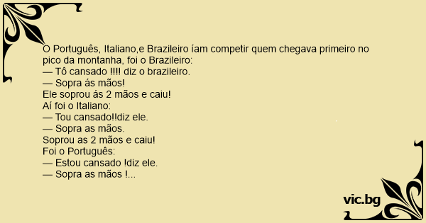 O Português, Italiano,e Brazileiro íam competir quem chegava primeiro no pico da montanha, foi o Brazileiro: