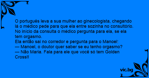 O português leva a sua mulher ao ginecologista, chegando lá o médico pede para que ela entre sozinha no consultório.