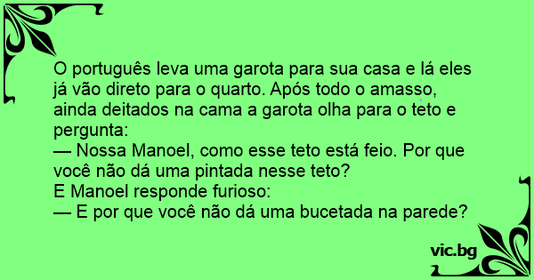 O português leva uma garota para sua casa e lá eles já vão direto para o quarto. Após todo o amasso, ainda deitados na cama a garota olha para o teto e pergunta: