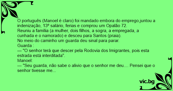 O português (Manoel é claro) foi mandado embora do emprego,juntou a indenização, 13º salário, ferias e comprou um Opalão 72.