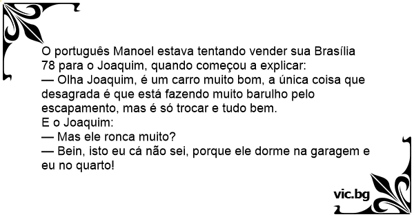 O português Manoel estava tentando vender sua Brasília 78 para o Joaquim, quando começou a explicar: