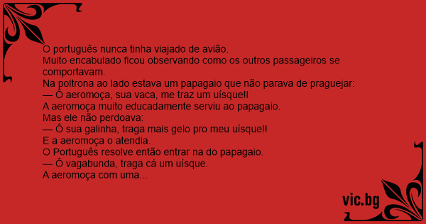 Nervoso com a turbulência, o sujeito, todo educado, pede pela quinta vez para a aeromoça lhe trazer um uísque, mas ela continua fingindo que não o ouve. Sentado ao seu lado, o papagaio comenta: —...