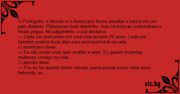 O Português, o Alemão e o Americano foram assaltar o banco em um país distante. Planejaram tudo direitinho, mas na hоrа se confundiram e foram pegos. No julgamento, o juiz declarou: