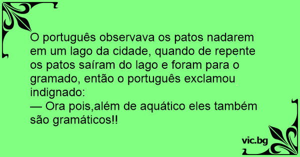 O português observava os patos nadarem em um lago da cidade, quando de repente os patos saíram do lago e foram para o gramado, então o português exclamou indignado: