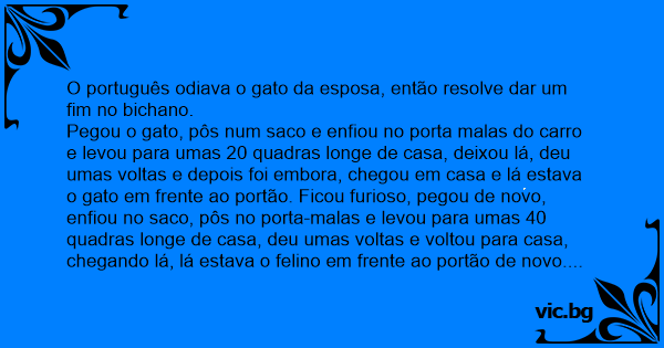 Pegou o gato, pôs num saco e enfiou no porta malas do carro e levou para umas 20 quadras longe de casa, deixou lá, deu umas voltas e depois foi embora, chegou em casa e lá estava o gato em frente ao portão. Ficou furioso, pegou de novo, enfiou no saco, pôs no porta-malas e levou para umas 40 quadras longe de casa, deu umas voltas e voltou para casa, chegando lá, lá estava o felino em frente ao portão de novo.