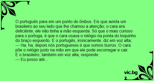 O português para em um ponto de ônibus. Eis que avista um brasileiro ao seu lado que lhe chamou a atenção; o cara era deficiênte, ele não tinha a mão esquerda. Só que o mais curioso para o portuga, é que o cara usava o relógio na ponta do toquinho do braço esquerdo. E o portugês, ironicamente, diz em voz alta:
