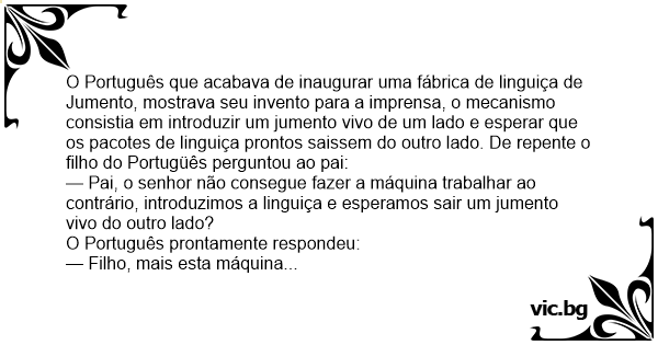 O Português que acabava de inaugurar uma fábrica de linguiça de Jumento, mostrava seu invento para a imprensa, o mecanismo consistia em introduzir um jumento vivo de um lado e esperar que os pacotes de linguiça prontos saissem do outro lado. De repente o filho do Portugüês perguntou ao pai: