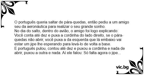 E português pulou, contou até dez e puxou a cordinha e nada de abrir, puxou a outra e nada. Aí ele falou: Só falta agora o jipe não está lá embaixo me esperando.