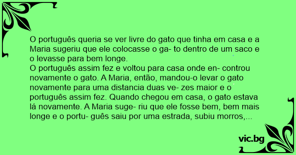 O português queria se ver livre do gato que tinha em casa e a Maria sugeriu que ele colocasse o ga- to dentro de um saco e o levasse para bem longe.